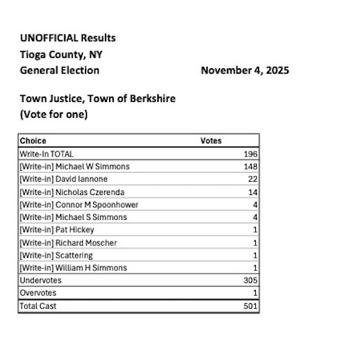 The Nov. 4 election in Tioga County, New York, saw several key seats turn from red to blue. But also on the ballot was a write-in campaign in Newark Valley that is subject to a recount, and a justice seat in Berkshire to be filled by a write-in candidate.