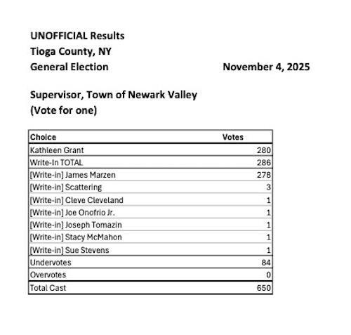 For the Town Supervisor seat in Newark Valley, Democrat Kathleen Grant is the projected winner of that contest, but only by a couple of votes. In that contest, the write-ins totaled 286, with James Marzen earning the majority of the write-in votes at 278. Grant received a total of 280.