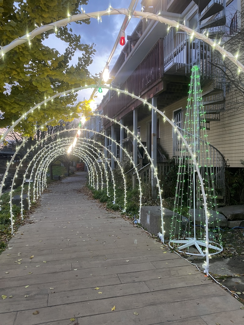 An illuminated archway has been added along the Owego Riverwalk, and it is hoped that other businesses will collaborate in expanding it. Please use caution when visiting the area during the holiday season. It is advised that you wear proper footwear and also carry a flashlight since the Riverwalk is currently not maintained. Photo provided.