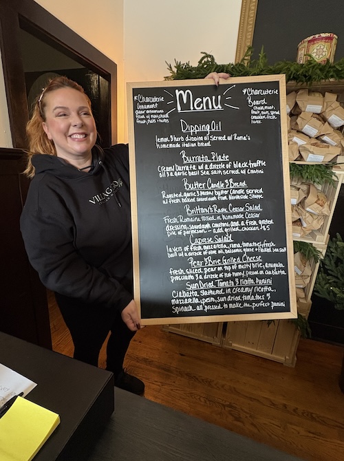 Jessica Miller-Cici holds up a menu board. They will be printing out menus that people can grab as they come in, but they are rolling out bistro items slowly. You can find them on their Facebook Page, Villaggio Italian Market, for updates, visit them at 173 Front St. in Owego, or email chris@villaggiomarket.com. (Photo by Wendy Post)