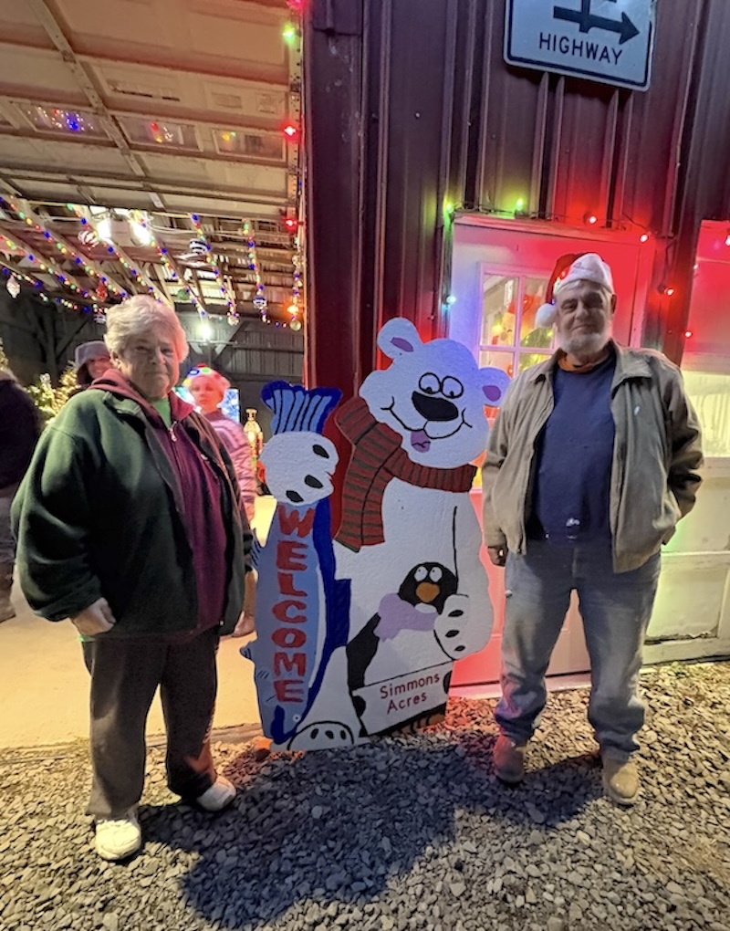 Jim and Cheryl Simmons are pictured outside the South Pole, next to one of the cleverly crafted cutouts they designed. (Photo by Wendy Post)