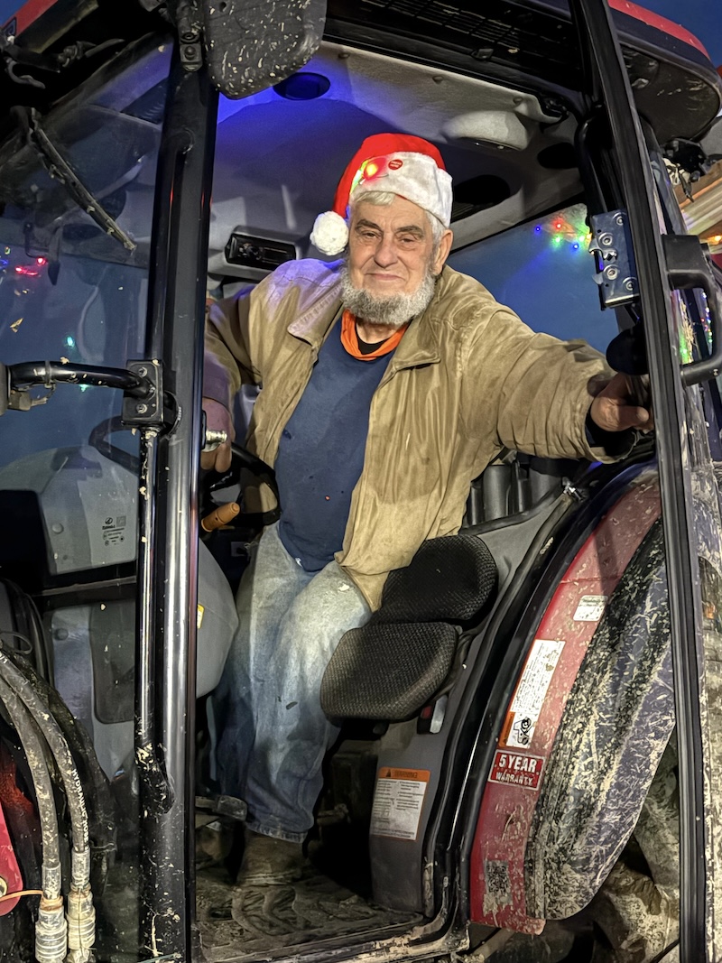 Jim Simmons hops into the tractor for an inaugural run through the lighted display at Simmons Acres LLC in Berkshire. (Photo by Wendy Post)
