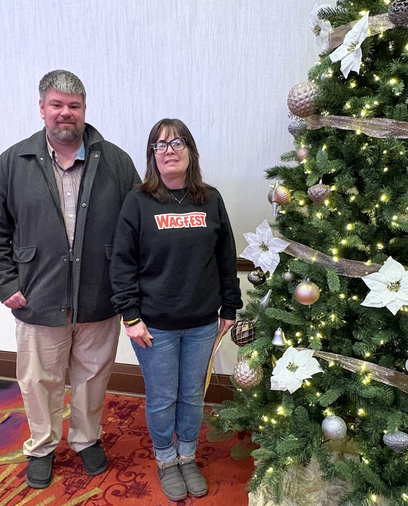 Sue Sterpe and John Brady, representing Wagfest and its Memorial Fund, arrive at Tioga Downs in Nichols, N.Y., on Giving Tuesday, Dec. 2. The local nonprofit helps families with expenses when they lose a child. Based in Chemung County, more information can be found at www.facebook.com/WagfestMemorialFund.
