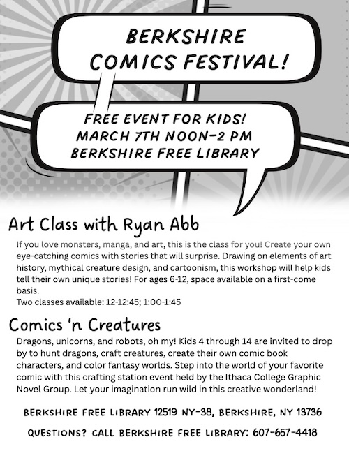 On March 7, from noon to 2 p.m., the Ithaca College Graphic Novel Group and Berkshire Free Library will present the Berkshire Comics Festival, a free event for kids ages four and up.