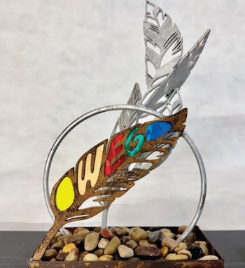 The installation begins with its first piece, “Indigenous Foundations: Where the Valley Widens,” acknowledging the Indigenous peoples who first lived along the river. A feather represents their presence, and organic forms and grounded circular motifs reference cycles, continuity, and stewardship.
