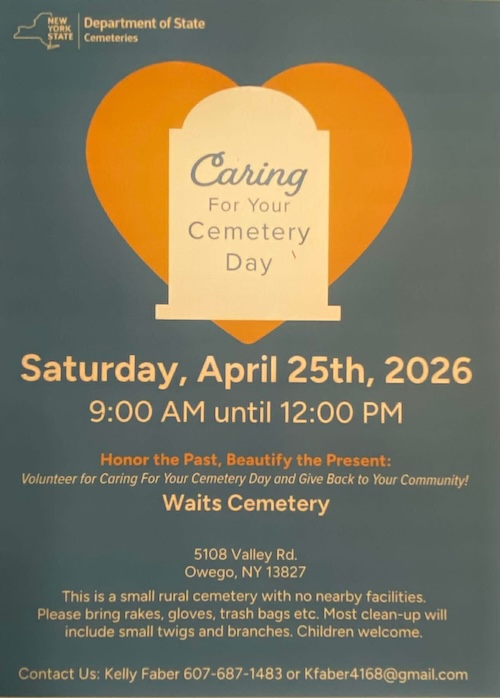 They would like to invite family, friends, and neighbors to participate in a special sound event on New York State Care for Your Cemetery Day. The church bell will be intentionally rung at noon on Saturday, April 25, as part of a community sound test to honor its original purpose and to understand how its voice carries across the countryside.